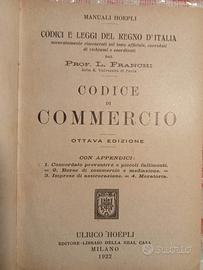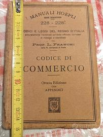 Il libro nell'immagine è un'edizione storica del Codice di Commercio pubblicata dalla casa editrice Hoepli di Milano, curata dal Professor Luigi Franchi. Fa parte della celebre collana dei Manuali Hoepli, nello specifico della "Serie Scientifica" con il numero di catalogo 228 - 228 bis.