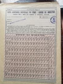 Cimelio 1943 Carta Annonaria Individuale per Pane e Generi da Minestra, valida per i mesi da marzo a giugno 1943-XXI.