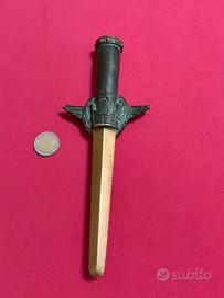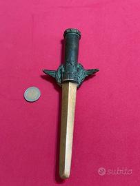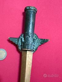 BELLISSIMO CIMELIO ANNI ’50/60 IN BRONZO DORATO E BRUNITO CON IMPUGNATURA A FORMA DI AQUILA CON EMBLEMA DELL’ESERCITO E DEDICA SULLA LAMA, prodotto nei primi anni del dopo guerra e donato come segno di onore a comandanti dell’Esercito Italiano. Materiale :Bronzo Dimensioni :24 cm. x 9,00 cm.