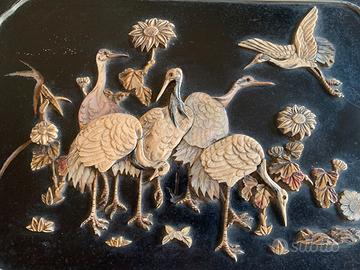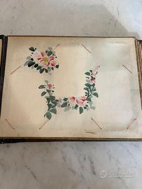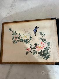 ANTICO ALBUM IN LACCA CON BELLISSIMI FENICOTTERI, FAUNA E FLORA IN MADREPERLA, CON FILIGRANA ARGENTATA. ALL'INTERNO OGNI PAGINA E' DECORATA CON ACQUARELLI RAFFIGURANTI PICCOLI E INCANTEVOLI PAESAGGI E IMMAGINI FLOREALI. CINA anni 1930 Misure: 36 x 28 - altezza cm 5