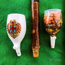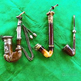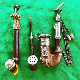 Antiche pipe in legno decorate, lavorate in rilievo, catena con ghiande e testa di leone, inserti in Argento. Parti in corno e guarniture d'argento. Le due pipe in legno e ceramica ( nelle ultime due foto ) probabilmente non complete. Grazie.