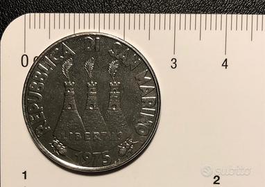 100 lire di San Marino coniate nel 1975.Queste monete commemorative sono note per la loro raffigurazione sul rovescio di un cane e un gatto accoccolati insieme, simbolo di "amore tra razze e ideologie diverse". Dettagli della Moneta : Repubblica di San Marino, 100 Lire, anno di Conio 1975, materiale Acmonital (Acciaio inossidabile) Peso 8,04 grammi, diametro: 27,8 mm