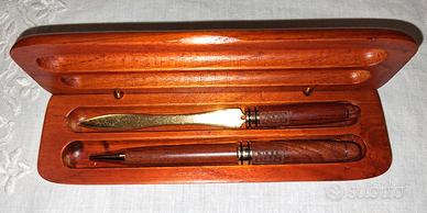 3-Penna a sfera e tagliacarte Niji Italiana. Esclusiva scatola in legno d'ulivo di alta qualità con angoli arrotondati e speciale finitura (17,6 x 5,5 cm). 100% legno d'ulivo, fatta a mano, venatura unica, prodotto in Italia.