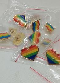 In metallo, di due tipi; 3 bandierine sventolanti i colori dell’arcobaleno PRIDE, e due cuoricini pieni di orgoglio