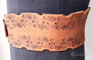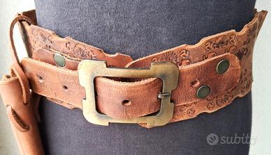 tupendo cinturone in cuoio marrone da Cowboy tipo Western Gun Belt con la sua fondina per la Colt 45 a tamburo. Modello artigianale fatto a mano riccamente decorato. Taglia grande da adulto (comunque regolabile), il cinturone è stato usato, è in condizioni comunque ancora molto valide, il cuoio è morbido ed ha il suo colore, non ci sono danni - rotture ecc. ha solo un aspetto vissuto che lo migliora enormemente a livello di realismo.