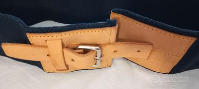 Cinturone Marina Militare, realizzato in tela e cuoio resistente. Colore Blu Navy. Lunghezza cm 92 Larghezza cm 9. Chiusura con cinghia resistente regolabile in pelle marrone chiaro, con componenti in metallo. Nuova in perfette condizioni.