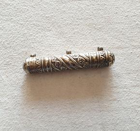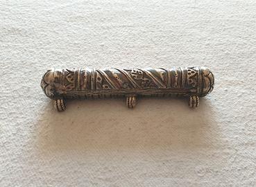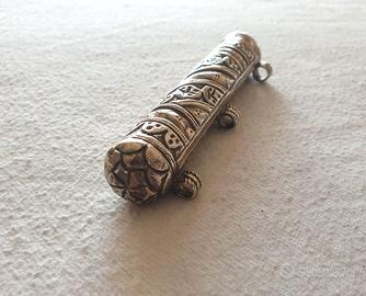 Antica Scatola di preghiera spirituale a tubo cilindro in argento con tre occhielli nella parte superiore e una decorazione cesellata con motivi floreali e tralci di vite. Conteneva pergamena, amuleto o motivo di preghiera e devozione. Talvolta indossato dai musulmani con la convinzione di ottenere protezione o benedizioni in virtù di ciò che contiene.