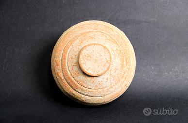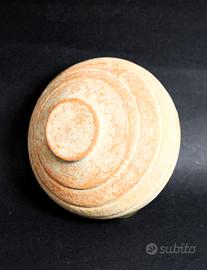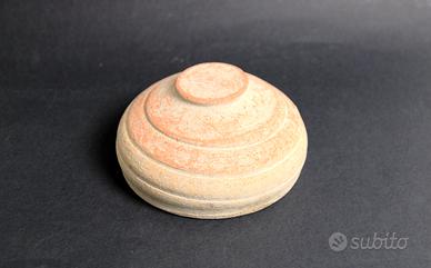 Questo contenitore in terracotta è stato realizzato al tornio, con il corpo