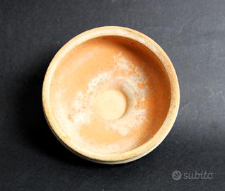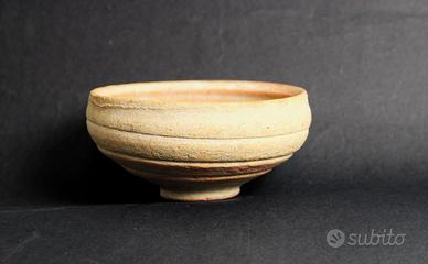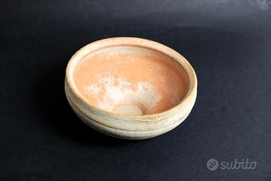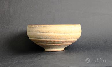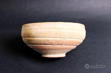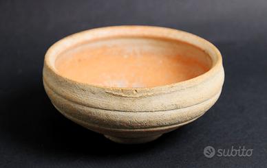 Originale coppa in terracotta a grana grossa dell'antica civiltà Romana, a forma di ciotola tonda con pareti scanalate a rotella e bordo riverso internamente.