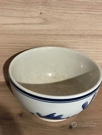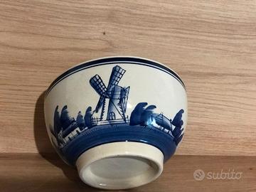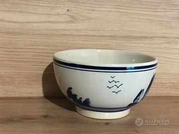 Ciotola da portata in ceramica in stile Delft Blauw Handwerk, dipinta a mano, bordi decorati di blu, con un motivo raffigurante un mulino a vento, uccelli e barche a vela, origine Olanda, vintage anni '60.