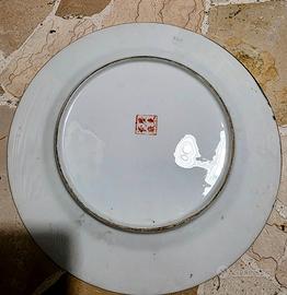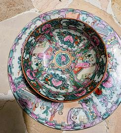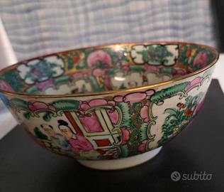 set composto da ciotola e piatto coordinato in porcellana decorata, caratterizzato da raffinati motivi in stile orientale “Famiglia Rosa”, con scene figurate, elementi floreali e dettagli dorati. La ciotola presenta una ricca decorazione interna con personaggi e motivi floreali policromi, impreziositi da bordatura dorata. Il piatto abbinato riprende lo stesso stile decorativo, rendendo il set armonioso e di forte impatto estetico. Sul fondo della ciotola è presente il marchio “Decorated in Hong Kong”, indicativo di produzione vintage (seconda metà del ‘900), ispirata alle porcellane cinesi tradizionali. 📏 Misure: • Ciotola: diametro 15 cm • Piatto: diametro 26 cm 📌 Condizioni: Buone condizioni generali. Decorazioni vivaci e ben conservate. ( 🎯 Ideale come: • elemento decorativo • centrotavola • oggetto da collezione