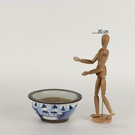 Ciotola in gres smaltato con decoro di case in riva a un fiume circondate da