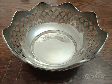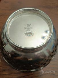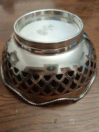 Ciotola in Sheffield Jordan collection. Vintage. Bordo e fascia laterale lavorata. Peso grammi 254. Diametro cm 16, diametro fondo cm 8,5, altezza cm 7. Ottime condizioni.