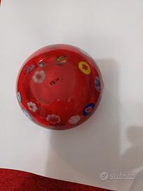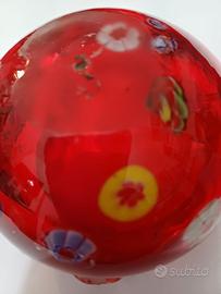 posacenere lavorazione vetro di murano con inclusioni di murrine di cm.8 di diametro x un altezza di cm.6. il posacenere ha 2 piccole scheggiature alla base(non visibili,quando e poggiato a terra)x il resto e in ottimo aspetto.