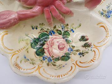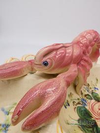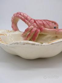 Originale ciotola centrotavola vintage in ceramica italiana, decorata con una grande aragosta in rilievo. Un pezzo eccentrico, dal gusto un po' kitsch, perfetto come antipastiera marina, centrotavola ironico o elemento decorativo per case al mare, cucine rustiche o collezioni di oggetti vintage.