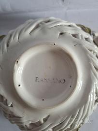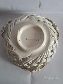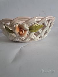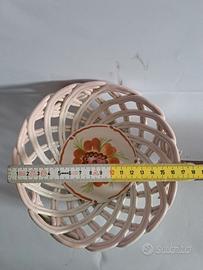 Ciotola vintage in ceramica intrecciata di Bassano. Fiore al centro e tre piccole roselline con petali sul bordo. Dipinta a mano, sfumata in rosa lungo tutto il bordo. Sul fondo piccoli fiorellini.
