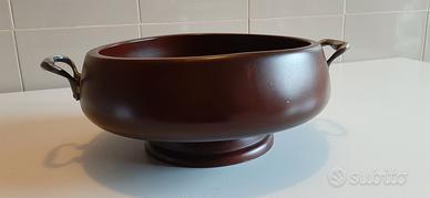 Ciotola in legno, vintage, con manici in metallo e base appoggio in legno. Portafrutta, centrotavola. Diametro cm 22, altezza cm 11.