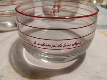 Tre ciotole in vetro delle patatine Pai anni Settanta, riportano la scritta "le snackerine pai che danno allegria". Diametro 9 cm, altezza 6 cm, in perfette condizioni. 15 euro più eventuali spese di spedizione