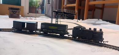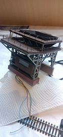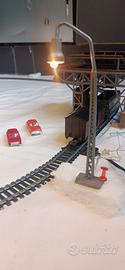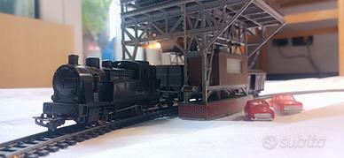 Circuito completo di binari con Vasca Carbone/terra , locomotiva inerente con Carri di carri di carico, lungo la tratta 4 lampioni , semaforo manuale , deviatore lima con via di fermata, attacco per corrente da collegare a qualsiasi controller.