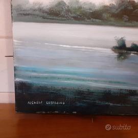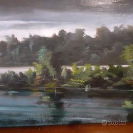 MICHELE CISTERNINO 1979, OLIO SU TAVOLA CORNICE EPOCA 50X70- GLI AGGANCI SONO SULLA TAVOLA PER NON SOLLECITARE LA CORNICE DATO PESO DELLA STESSA, " PAESAGGIO FLUVIALE" - PRIMA ERA DEL MAESTRO, POI NATURE MORTE E SOGGETTI DI CACCIA- NATO A MARGHERITA DI SAVOIA 1931. MS SU SUBITO X INFO E ED EVENTUALE VISIONE O RITIRO