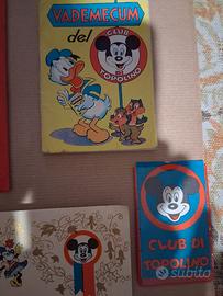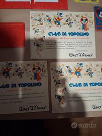 Club di Topolino. cartella raccoglitore, 3 distintivi metallici, carta intestata e buste con raccoglitore. vademecum del club. tessera con bollini annuali, 3 diplomi, portafoglio, scheda raccolta punti e scheda per costituzione distaccamento.