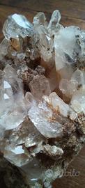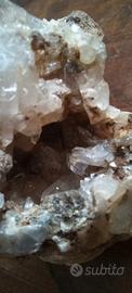 Aggregato di quarzo ialino e porzioni lattiginose di quarzo latteo con zone leggermente colorate che potrebbero corrispondere a quarzo fumè lieve. Le macchie scure nella matrice sono minerali accessori: cristalli di tormalina nera ( schrol ). Campione proveniente dalle Alpi Svizzere, Canton Grigioni Val Medel, regione Surselva Piz Ault.