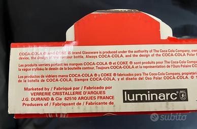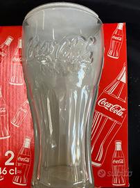 Sono 2 bicchieri originali Coca-Cola modello iconico Contour, realizzati in vetro trasparente con il classico design sagomato e il logo del marchio in rilievo.