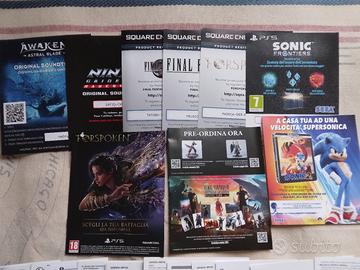 Vendo i seguenti codici da riscattare online (per contenuti aggiuntivi, bonus e altro), volantini pubblicitari e fogli di garanzia, in ottime condizioni, per Ps5: