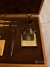 Include accendino, fiaschetta, pinzetta e utensili come da foto, in metallo placcato (probabile ottone dorato)