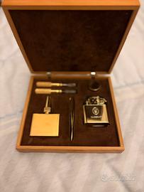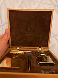 Cofanetto in legno con interno rivestito, contenente set accessori brandizzati Maserati.