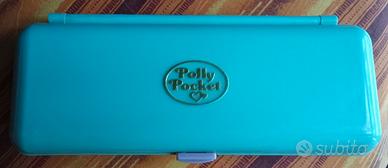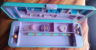 Cofanetto astuccio portapenne Polly Pocket originale Bluebird del 1990 "Pencil case", completo al 100% di bamboline, gomma, matita, temperino e teca decorata per Polly. Chiusura funzionante e scritta dorata sul coperchio integra.