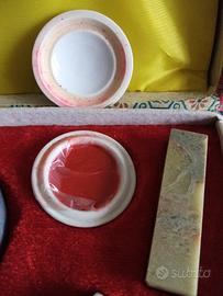 Cofanetto in tessuto rosso nuovo e completo per calligrafia cinese. Mai usato. Piccoli difetti come da foto.