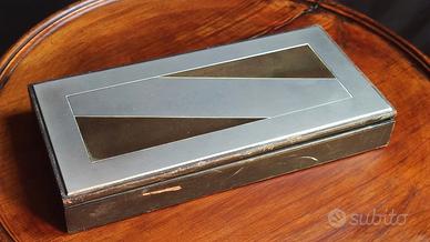 Elegante cofanetto da gioco porta carte anni '60 in metallo con dadi e fiches.