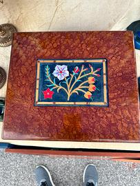 Cofanetto: Il coperchio del cofanetto presenta una lastra di pietra intarsiata a mano con motivi floreali realizzati con pietre semipreziose.