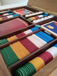 Splendido cofanetto da gioco vintage originale Dal Negro, perfetto per collezionisti o per chi ama il fascino del gioco “di una volta”. Realizzato in legno con interno organizzato in scomparti, il set si presenta completo e ben conservato. Include: • 2 mazzi di carte Dal Negro • Set completo di fiches colorate • Dadi da gioco • Elegante astuccio per dadi Il tutto racchiuso in una raffinata scatola rigida con finiture tipiche dell’epoca, ideale anche come oggetto d’arredo. 📌 Condizioni: molto buone, con normali segni del tempo (vedi foto) 📌 Epoca: fine anni ‘70 inizio ’80 📌 Perfetto per: collezionismo, regalo, arredamento vintage o serate di gioco Oggetto sempre più difficile da trovare completo in queste condizioni! 📍 Consegna a mano o spedizione disponibile Per qualsiasi informazione o altre foto, contattami senza problemi! PS: NELLA MIA GALLERIA POTETE TROVARE ALTRI SET DA GIOCO