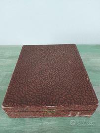 Il cofanetto, in stile Art Déco italiano, presenta una finitura esterna a imitazione pelle in tonalità bordeaux/marrone-rossastro e interni rivestiti in tessuto satinato con stampa originale.
