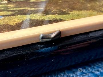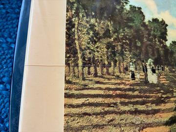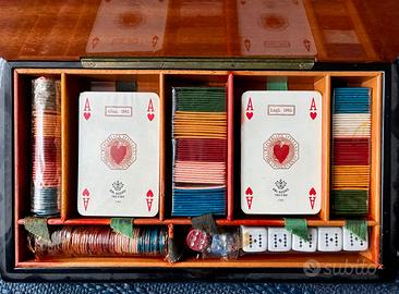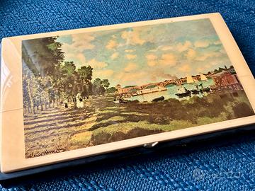 Set da gioco vintage Dal Negro (Treviso), datato luglio 1965 (autenticato da bollo fiscale d’epoca). Presenta sul coperchio una riproduzione de "Il Bacino di Argenteuil" di Claude Monet. Set completo: Include 2 mazzi di carte originali, fiches circolari e rettangolari, dadi bianchi e colorati. Mazzi di carte e fiches sono ancora nel cellophane originale. Materiali: Cofanetto in legno con finitura lucida, divisori interni e nastrini originali. Ottime condizioni generali. Si segnala una filatura sul coperchio dovuta all'età (non strutturale), che conferisce autenticità al pezzo (vedi foto). Ideale per collezionisti, amanti del modernariato o come esclusivo oggetto d'arredo. Disponibile per ritiro a mano o spedizione con imballaggio accurato e protetto. Prezzo leggermente trattabile.