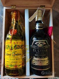 Cofanetto in legno di coppia bottiglie Brandy Gran Riserva e El Cesar Cream Sherry. Perfette, sigillate, con tutto il liquore all'interno. Sono da collezione