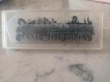 Pedine contrassegni e segnaposto della casata Baratheon originali del gioco da tavolo Risiko Trono di spade (Risk Game of Thrones), formato da accuratissime miniature di cavalieri, cervo casata e castello. Ritiro a Roma. Non trattabile.