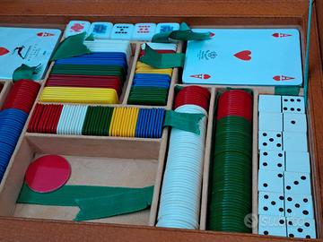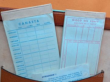 Fiches, gioco del domino, due mazzi di carte nuovi (ma non originali dell'epoca), tabelle segnapunti canasta, gioco del ponte integre.