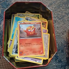 Cofanetto Pokemon metallo contenente ca 150 carte in buono stato.