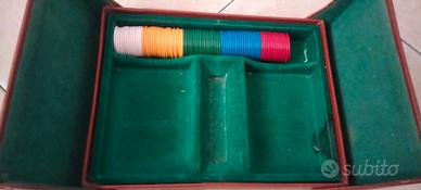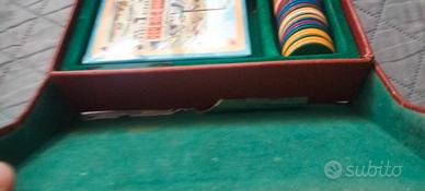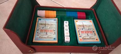 Vendo cofanetto poker originale Modiano, edizione speciale per la STOCK. Carte non della modiano ma della stravecchio branca di cui una confezione ancora plastificata, cofanetto in pelle, 5 dadi e fiches penta colore. Presumibilmente anni 60. Condizioni ottimali, unica pecca il rivestimento verde da una parte è usurato. Tutto come da foto. Rimango a disposizione per info o foto. Possibiltà di ritiro a mano o spedizione con corriere.