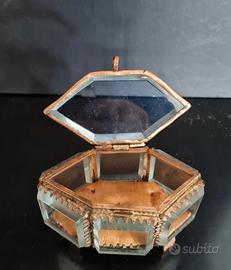 Cofanetto porta-fedi nuziali francese fine '800 in vetro smussato color bronzo dorato .Realizzato a forma di esagono cm 10 x cm 5 x cm 7 piccola sbeccatura angolare come da foto . no tutto subito .Vendo € 158 . Gradito contatto telefonico wapp 3478314154