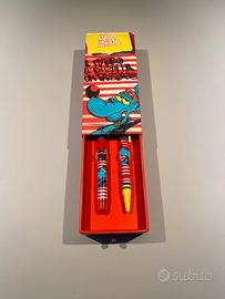 Cofanetto di Lupo Alberto contenente 2 penne (una penna stilografica e una penna a sfera ancora funzionante). Grafica a tema “Il futuro è di chi ha un passato”, riportata sia sulla scatola in cartone sia sulle penne. Il cofanetto simula un cassettino che si estrae tirando una piccola maniglia, all’interno del quale le 2 penne sono fissate attraverso una clip in plastica. Mai usate, confezione in ottimo stato ad eccezione dei 2 angoli sul retro leggermente sfogliati.