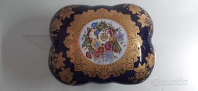 Cofanetto portagioie in fine porcellana color blu cobalto con decoro floreale e inserti dorati. French Design anni '40 dipinto a mano e con dimensioni 18 X 14 cm - altezza 9 cm. Eccellente stato di conservazione come da foto.