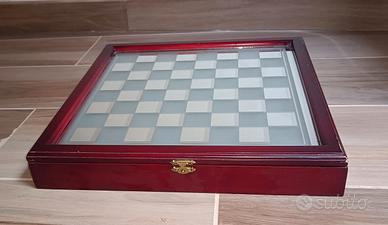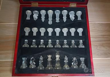 Elegante cofanetto per scacchi con pedine in vetro trasparente e satinato. La base interna è rivestita in velluto nero per proteggere i pezzi.