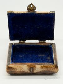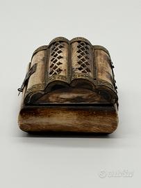 Cofanetto/scrigno vintage in osso vero (non effetto) con inserti e minuteria in ottone e interno rivestito in velluto blu. Chiusura frontale e cerniere funzionanti.