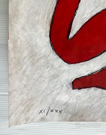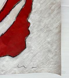 Litografia materica “Cola” di Mario Schifano (1934-1998) Firma e tiratura in basso: XI / XXX Tecnica: Litografia materica su carta pacchi Dimensioni senza cornice: 59,5 x 79 cm Dimensioni con cornice: 74,5 × 93 cm Mario Schifano, artista dall’animo ribelle e graffiante, è oggi considerato uno dei più prolifici pittori del secondo dopoguerra. Attira fin da subito la critica realizzando quadri monocromi che offrono l’idea di uno schermo fotografico che in seguito accoglierà numeri, lettere, segnali stradali, marchi della Esso e della Coca Cola. Ha vissuto a New York dove ha frequentato Frank O’Hara, Jasper Johns e Andy Warhol.