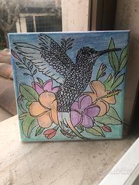 Un’opera vibrante e delicata, realizzata su tela 16x16 cm con tecnica mista. Il colibrì, simbolo di libertà e leggerezza, si libra tra fiori colorati su uno sfondo sfumato di azzurro, creando un’armonia visiva che trasmette energia e serenità. Perfetto per aggiungere un tocco di natura e vivacità a qualsiasi ambiente, questo dipinto è unico e fatto a mano con cura nei dettagli.