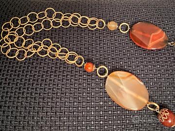 Lunga collana in acciaio laminato rosa ed agata rossa-arancio lunga circa 40 cm doppia.